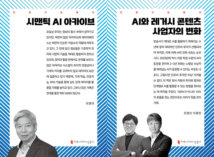 『시맨틱 AI 아카이브』(조명대 지음)는 데이터와 지식의 연결 방식을 시맨틱 기술과 기호학적 접근을 통해 제시하며, 차세대 아카이브 시스템의 방향을 제안한다. 『AI와 레거시 콘텐츠 사업자의 변화』(조영신·이종민 공저)는 전통 방송사와 콘텐츠 기업들이 AI를 활용해 제작 환경과 마케팅을 어떻게 변화시키고 있는지에 주목한다.