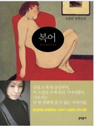 <복어>의 표지는 처음부터 직설적으로 암시했다. 회색의 벽면이 두 개 보이고 한쪽 벽면에는 그림이 걸려 있다. 그 액자 아래 조경란 장편소설이라고 박혀 있다. 바닥은 빨갛고 덩그러니 놓여 있는 소파도 빨갛다. 그 위에 나신의 여인이 고개를 기대고 한쪽 팔을 떨구고 다리를 그러모아 앉아 있다. 여인의 얼굴은 붉다. 귀도 붉다. 머리도 붉고 입술도 붉다. 내게 보이지 않는 것은 알 수 없는 다른 한쪽 팔, 그리고 여인의 몸 중앙에 검은 타원이 있다. 아니 검은 타원은 여인의 몸을 가리고 그림 위에 잉크를 부었다. 그 속에 크게 복어라는 선명하게 하얀 글씨, 그 아래 Blowfish 라는 적색의 글씨가 잘 보이지 않게 찍혀 있다. 검은 타원은 여인의 몸을 가렸지만 독자로 하여금 이것은 ‘죽음’에 관한, 조금 더 정확하게는 ‘자살’에 관한 이야기입니다, 라고 미리 선전포고를 한 셈이다. 그래서 고백하건데 선뜻 손이 가지는 않았다. 하지만 표지의 그림은 표면만 이야기했다. 이제 내면은 책을 끝까지 읽어야만 얻어지는 선물이 아닐까 싶다.