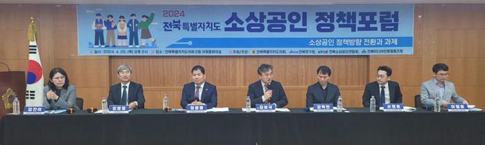 2024년 4월 25일 목요일 오후 2시 전북특별자치도의회 2층 의원총회의실에서 전북특별자치도의회, 전북연구원, 전북소상공인연합회, 전북미디어언론협동조합이 공동으로 주최주관하는 소상공인 정책포럼이 소상공인 정책방향 전환과 과제라는 주제로 열렸다.