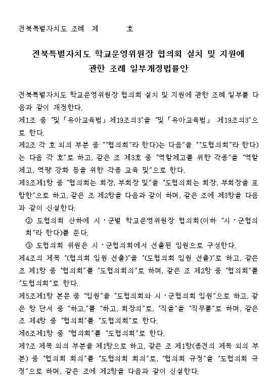 개정조례안은 도협의회 사업에 대한 개정, 시·군별 학교운영위원회 협의회 근거 신설, 의견 개진 제도 신설, 지원 및 지도 관련 규정 개정 등을 포함하고 있다. 이를 통해 학교운영의 자율성을 높이고 지역 실정에 맞는 창의적인 교육이 이루어질 수 있도록 기틀을 마련했다.
