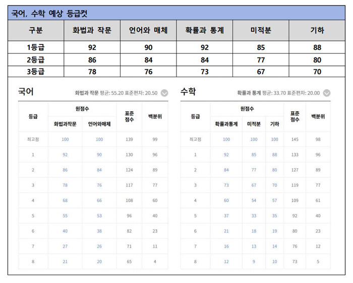 국어 영역에서 화법과 작문은 1등급 92점, 2등급 86점, 3등급 78점, 언어와 매체는 1등급 90점, 2등급 84점, 3등급 76점이고, 수학 영역에서 확률과 통계는 1등급 92점, 2등급 84점, 3등급 73점, 미적분: 1등급 85점, 2등급 77점, 3등급 67점, 기하는 1등급 88점, 2등급 80점, 3등급 70점으로 예상된다.