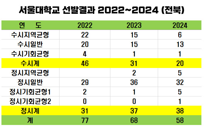 서울대학교의 정시 모집 최초 합격자 발표는 2025학년도에는 2월 7일에 발표될 예정이다. 그래서 정시와 수시에서 2022년 부터 2024년까지 확인해보면 2022년도에 77명, 2023년도에 68명, 2024년도에 58명으로 지속적으로 감소한 것을 볼 수 있다. 2024년도 총 서울대 합격자 58명 중에서 정시합격자는 38명인데 전국단위 모집 자사고인 상산고 출신 학생만 33명에 이르기 때문에 전북지역 내 일반 고등학교 학생들이 정시전형에서조차 서울대 진학에 어려움을 겪고 있음을 보여준다.