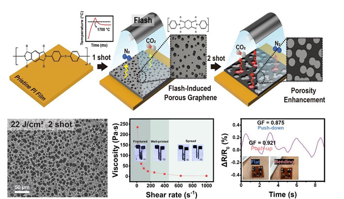 이한얼 교수 연구팀은 초고속 플래시광 조사 기술을 이용한 새로운 그래핀 합성법을 개발했다. 이 기술을 활용하면 고순도·고전도성의 3D 다공성 그래핀을 단시간 내에 생산할 수 있으며, 넓은 표면적과 뛰어난 생체 신호 감지 능력을 갖춘 웨어러블 센서 제작이 가능해진다.