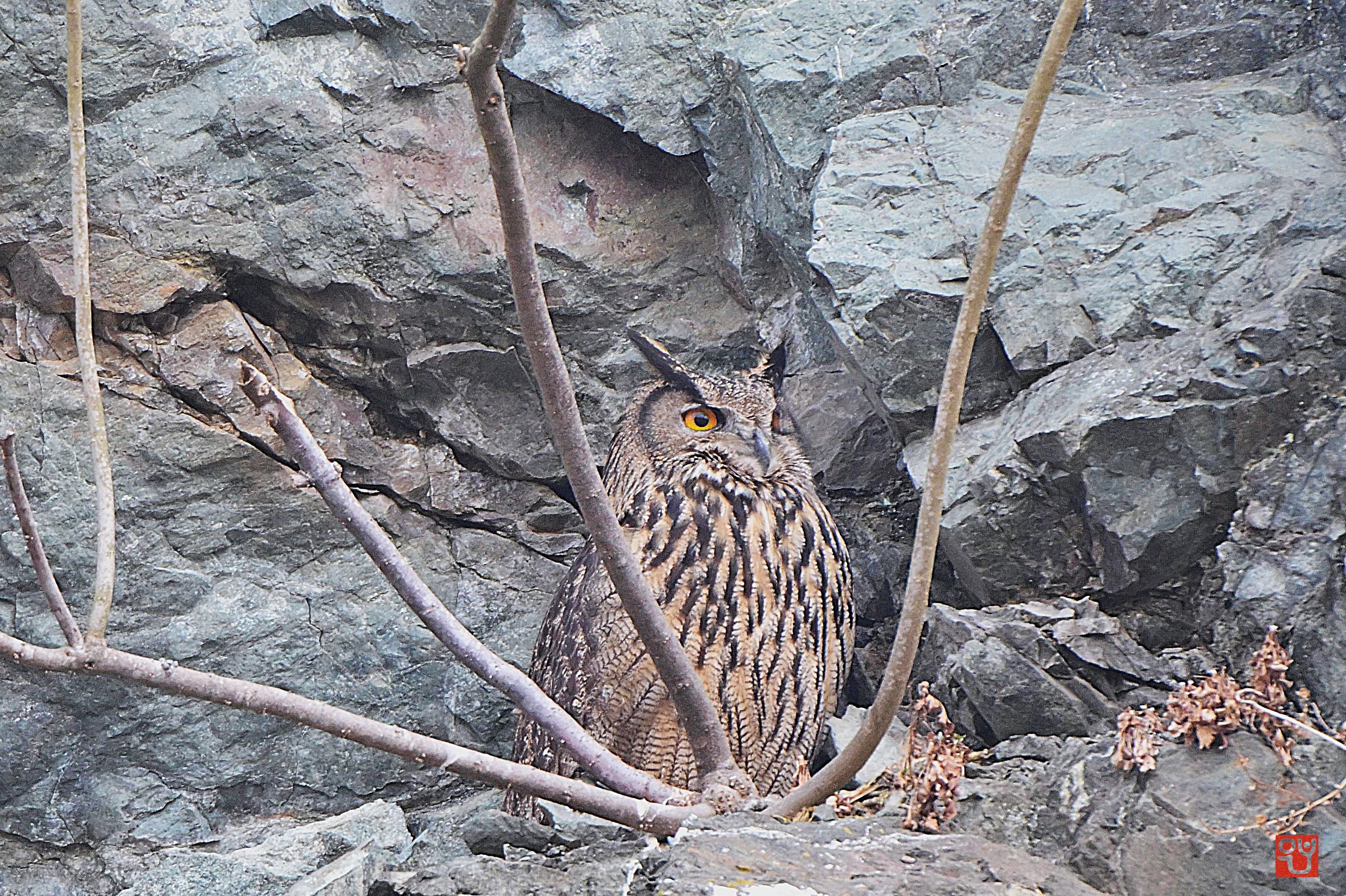 우리고장 계화도 돈지 마을 암벽에 수리부엉이는 육추에 들어간지 벌써 한달이 넘었다. 지금은 새끼를 어미가 늘상 품고 있는 것이 아니라 부근에서 지키고 있다.