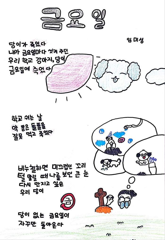 저학년 대상 수상자인 박서영 학생 가족은 임미성 시인의 동시 ‘금요일’을 선정했다. 박서영 학생은 “책을 보다 ‘금요일’이라는 글씨가 눈에 들어와 읽었는데 키우던 햄스터가 죽은 기억이 떠올라서 이 동시를 선택하였다. 죽은 햄스터가 떠올라 행복했고 그림에는 안 나와 있지만 내용이 잘 생각나게 써 있어서 재미있었다.”고 전했다.